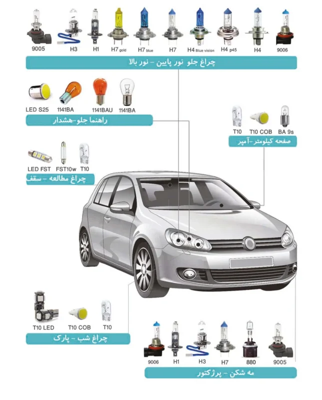 - هدلایت و لامپ چراغ جلو (H1، H3، H4، H7، 9005، 9006 و …)